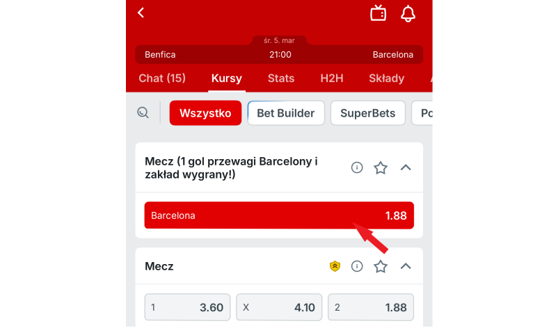 • "Mecz (1 gol przewagi Barcelony i zakład wygrany)” – Barcelona  kliknij TUTAJ, aby dodać zakład do kuponu (dostępny wyłącznie w ofercie przedmeczowej)