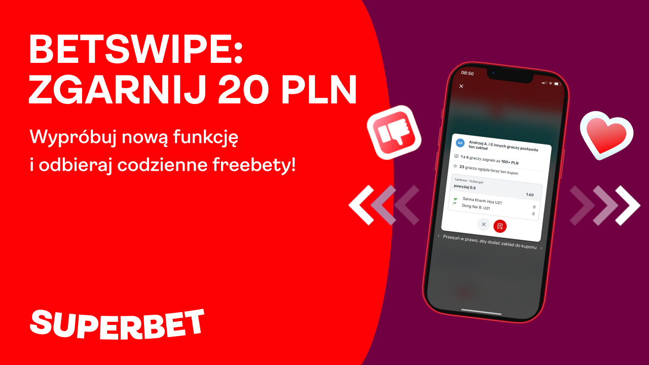 Słyszałeś już o naszej nowej superfunkcji w zakładach LIVE? To idealny moment, żeby przetestować Betswipe - do zgarnięcia aż 4 freebety o wartości 20 PLN!
