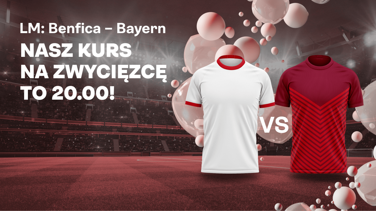 - Bonus w tej promocji to powiększony kurs w wysokości 20.00 na zwycięstwo Benfiki albo Bayernu z uwzględnieniem, że maksymalna stawka zakładu wliczana do bonusu to 10 zł.