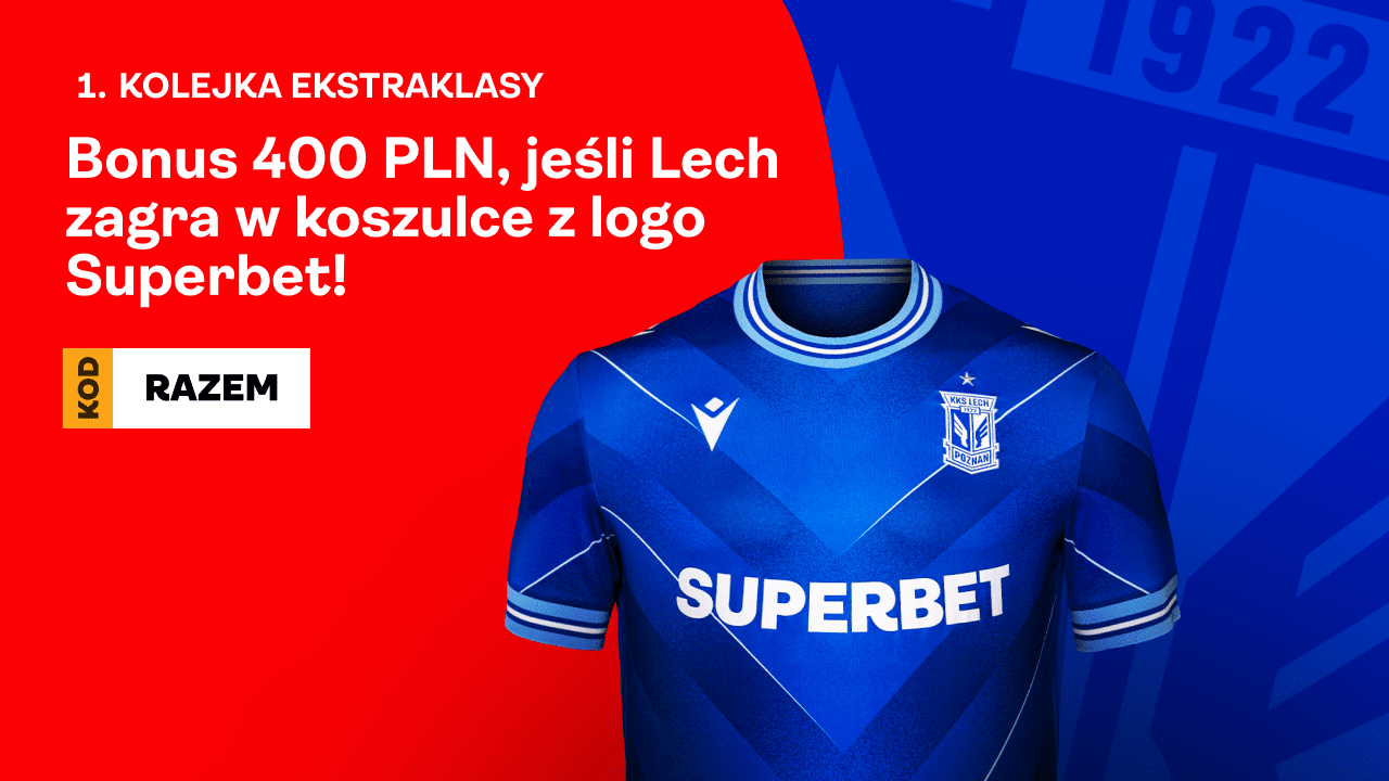 Zarejestruj się w Superbet z kodem RAZEM, wpłać pierwszy depozyt o minimalnej wartości 50 zł i postaw swój pierwszy kupon singiel, na którym znajduje się dowolny zakład z oferty przedmeczowej na Lecha Poznań w meczu z Piastem Gliwice (mecz odbędzie się w dniu 22.07.2023), stawiając minimalnie 2 PLN. Jeśli Lechici zagrają w koszulkach z logo Superbet, otrzymasz ekstra bonus 400 PLN.