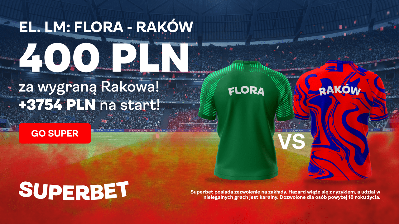 Zarejestruj się w Superbet, wpłać pierwszy depozyt o minimalnej wartości 50 zł i postaw swój pierwszy kupon singiel, na którym znajduje się zakład z oferty przedmeczowej na zwycięstwo Rakowa Częstochowa w meczu z Florą Tallinn, stawiając minimalnie 2 PLN.