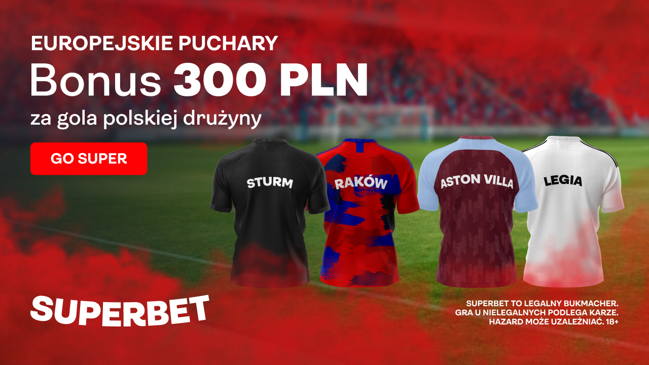Jeżeli Gracz postawi pierwszy kupon singiel po założeniu konta ze stawką co najmniej 2 PLN wybierając z oferty przedmeczowej dowolny zakład z minimalnym kursem 1.14 na mecz Legii lub Rakowa w europejskich pucharach, Gracz otrzyma ewentualną wygraną za kupon oraz bonus w wysokości 300 PLN pod warunkiem, że polska drużyna przynajmniej w jednym z tych meczów strzeli choćby jednego gola.