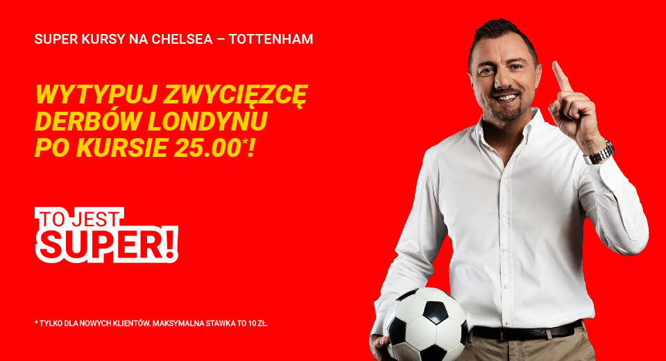 Wystarczy, że postawisz na zwycięstwo Chelsea albo Tottenhamu. Jeśli trafisz, wypłacimy Ci dodatkową wygraną w postaci bonusu. Maksymalna stawka to 10 zł. Minimalny depozyt wynosi 50 zł. Pamiętaj, w promocji mogą wziąć udział tylko nowi użytkownicy.