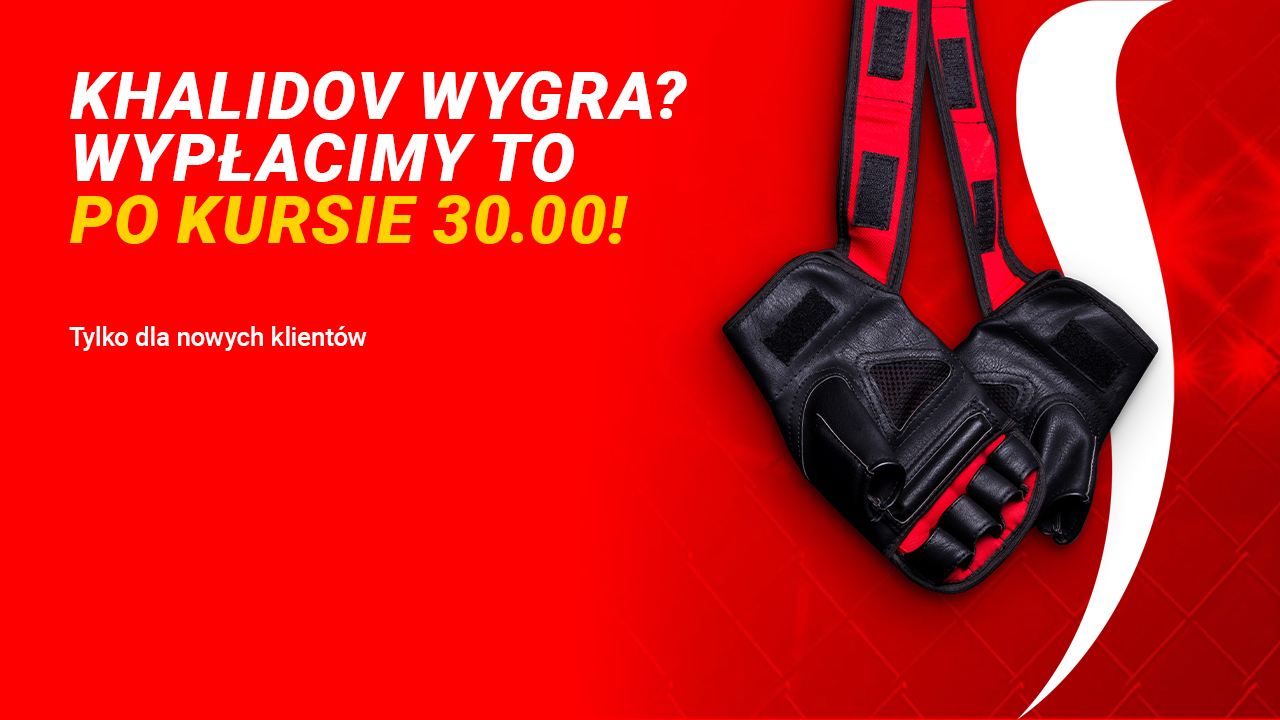 - Bonus w tej promocji to powiększony kurs w wysokości 30 na zwycięstwo M. Khalidova, z uwzględnieniem, że maksymalna stawka zakładu wliczana do bonusu to 10 PLN.