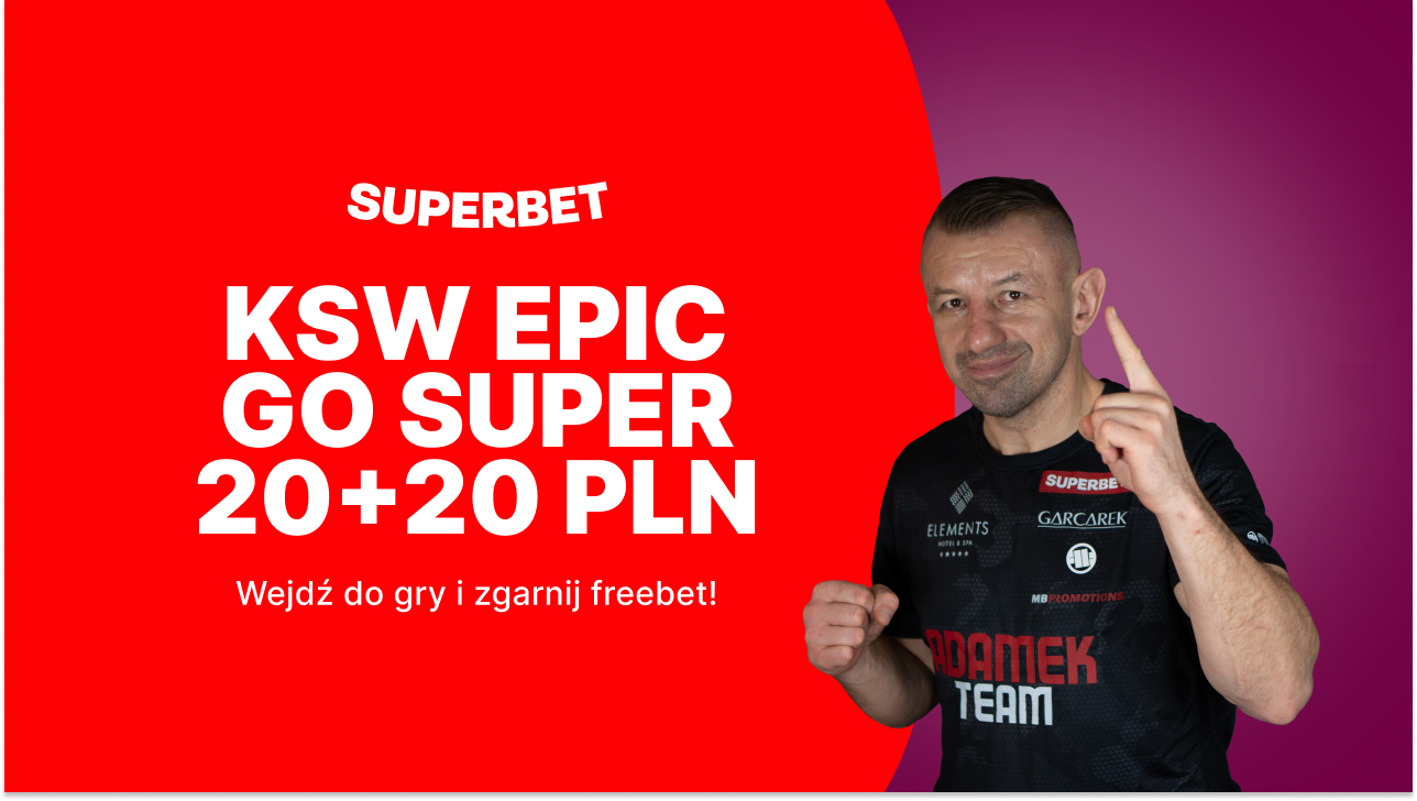 W Gliwicach będzie dziś naprawdę gorąco! Jedyna w swoim rodzaju gala mieszanych sztuk walki KSW Epic odbędzie się już dzisiaj, a w walce wieczoru zobaczymy ekscytujące starcie legend, czyli Mamed Khalidov vs Tomasz Adamek. W Superbet możesz liczyć na dodatkową dawkę wrażeń, dzięki wyjątkowej promocji - wejdź do gry i zgarnij 20 PLN w formie freebetu! No i SUPER!