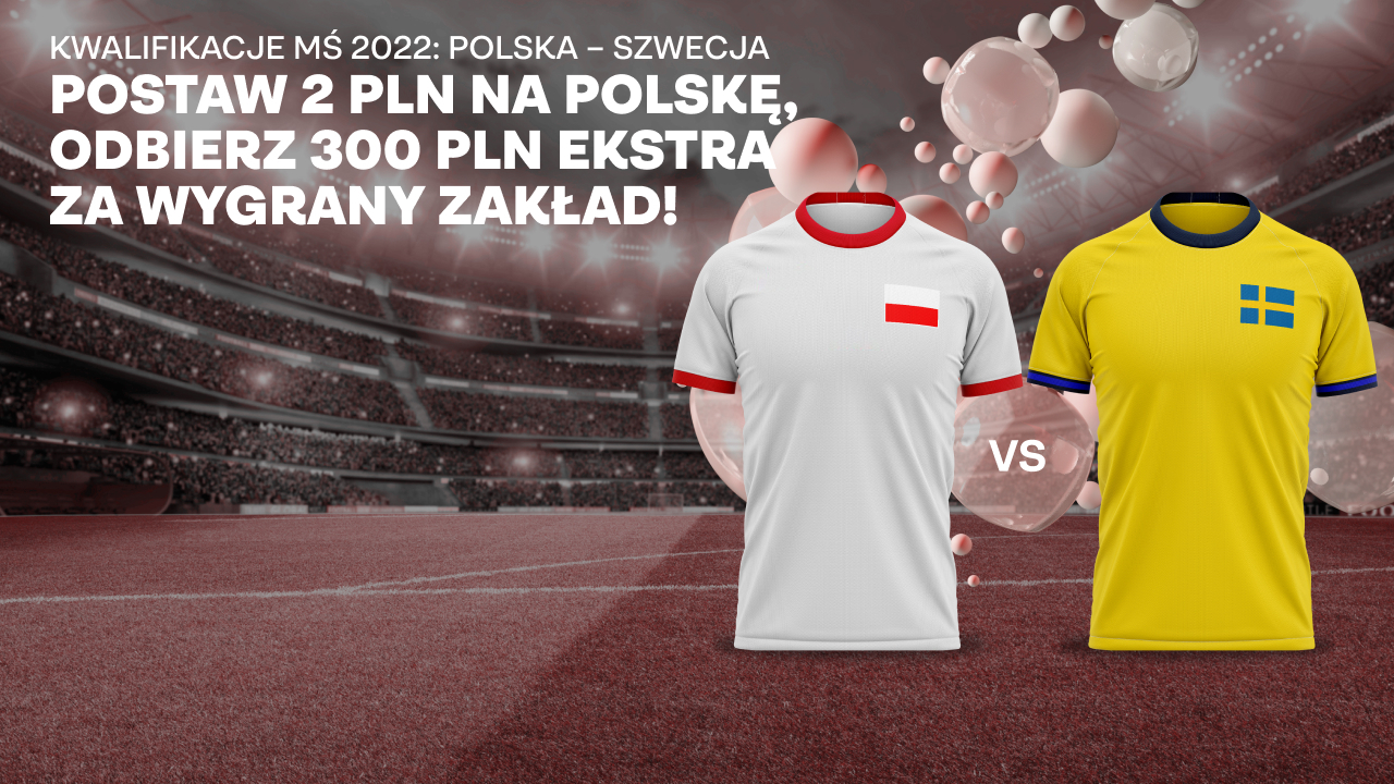 - Bonus w tej promocji to 300 PLN za poprawny typ na zwycięstwo Polski w meczu ze Szwecją w regulaminowym czasie gry lub awans Polski do MŚ 2022 (rodzaj zakładu - „mecz, typ zakładu 1” lub rodzaj zakładu – „awans”, typ zakładu „1”) z uwzględnieniem, że minimalna stawka zakładu to 2 PLN.