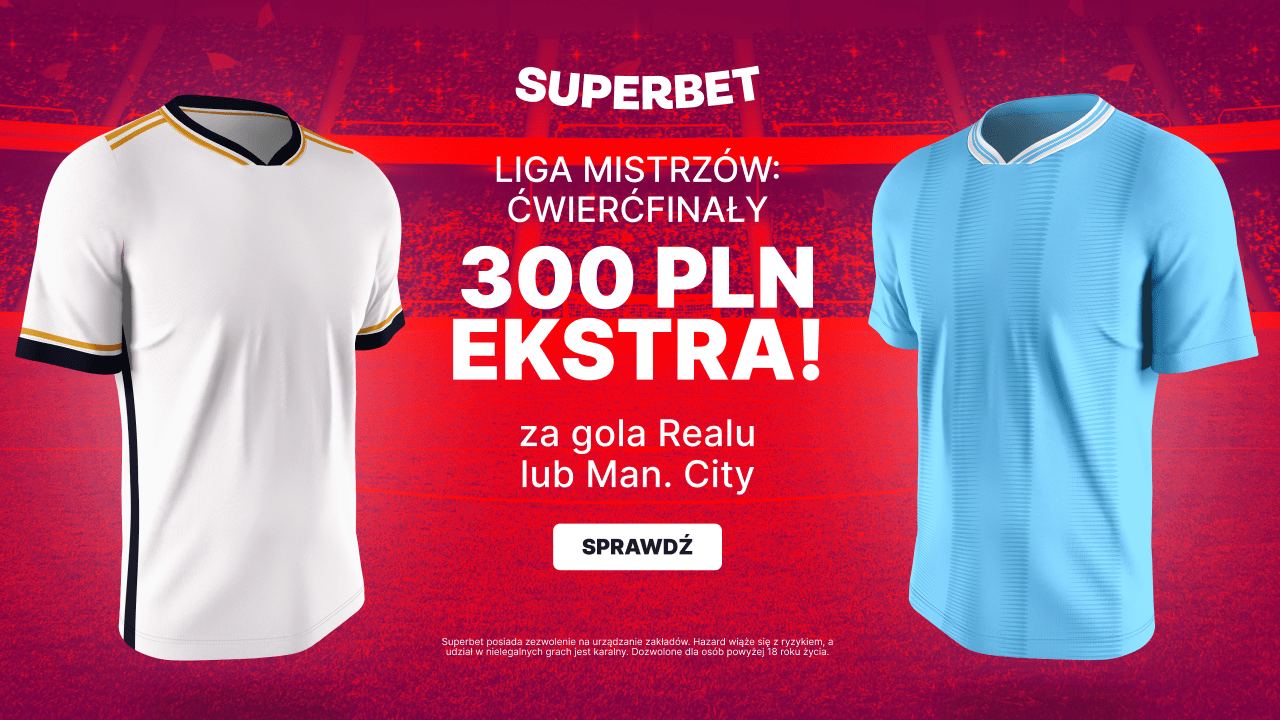 Zarejestruj się w Superbet, wpłać pierwszy depozyt o minimalnej wartości 50 zł i postaw swój pierwszy kupon singiel, na którym znajduje się zakład z oferty przedmeczowej na gola wybranej drużyny w meczu Real Madryt - Manchester City (wydarzenie odbędzie się w dniu 09.04.2024), stawiając minimalnie 2 PLN. Jeśli Twój kupon okaże się wygrany, otrzymasz Bonus 300 PLN.