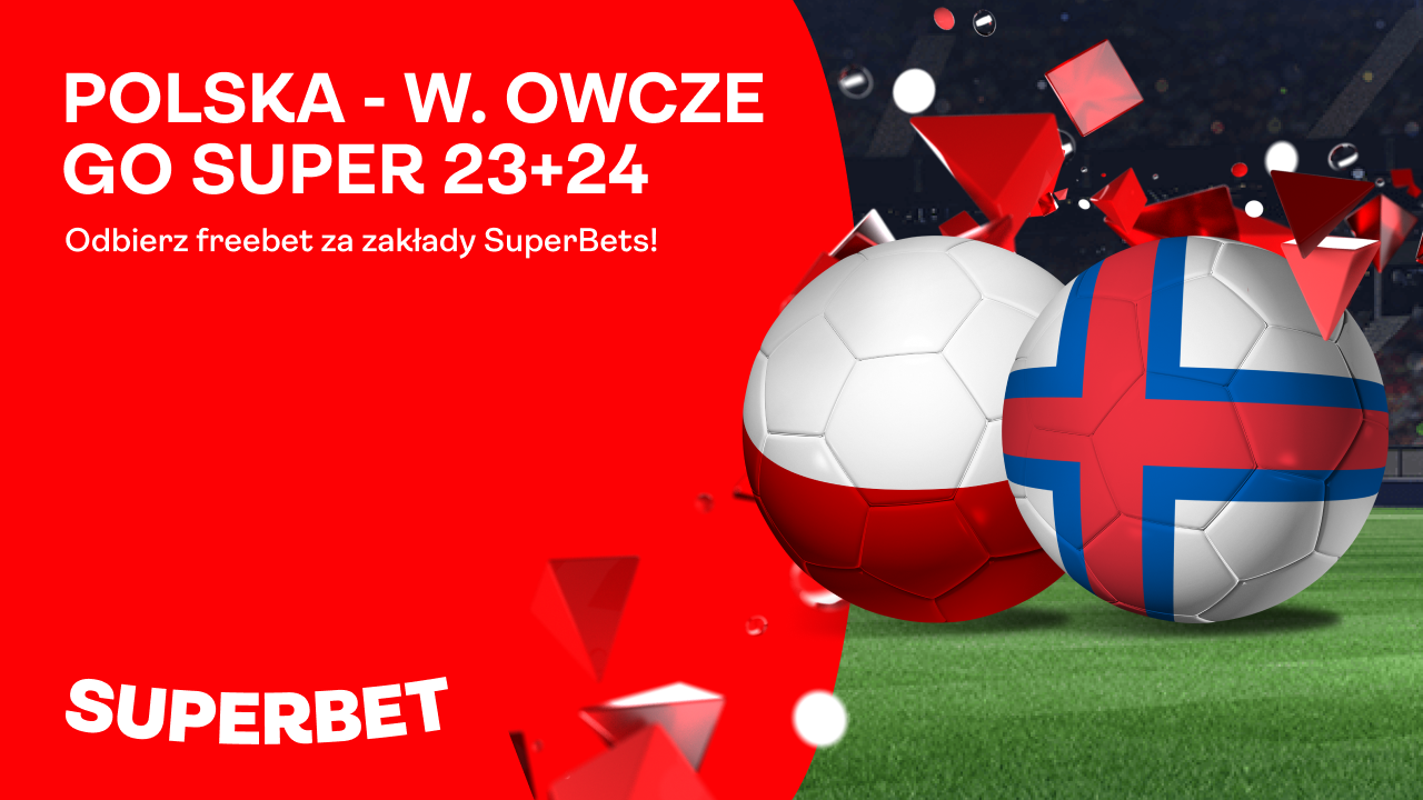 - Postaw za min. 23 PLN zakład SuperBets (singiel) na mecz Polska - Wyspy Owcze (eliminacje EURO 2024) z dzisiejszego dnia.