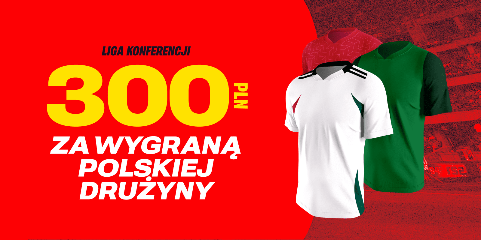 - Za poprawny typ na zwycięstwo wybranej polskiej drużyny (Legii Warszawa, Wisły Kraków lub Śląska Wrocław) w jednym z meczów kwalifikacji Ligi Konferencji, Gracz otrzyma Bonus 300 PLN z uwzględnieniem, że minimalna stawka zakładu to 2 PLN, ale w przypadku wyższej stawki, stawka zaliczana do promocji wynosi 2 PLN.