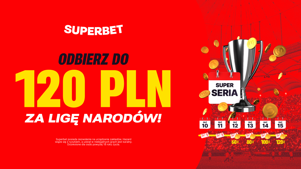 👉 Postaw kupon (solo/multi) za min. 20 PLN, zawierający wyłącznie zakłady Superbets i/lub zakłady Bet Builder na mecze Ligi Narodów UEFA w piłce nożnej z bieżącego dnia. Gracz musi postawić przynajmniej 1 taki kupon dziennie, przez okres minimum 3 kolejnych dni.