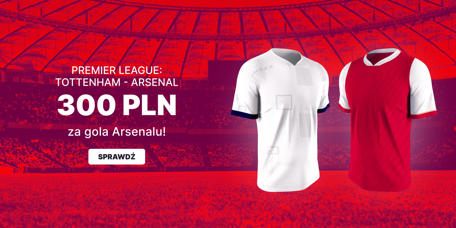 - Za poprawny typ na gola Arsenalu w meczu z Tottenhamem, Gracz otrzyma Bonus 300 PLN z uwzględnieniem, że minimalna stawka zakładu to 2 PLN, ale w przypadku wyższej stawki, stawka zaliczana do promocji wynosi 2 PLN.