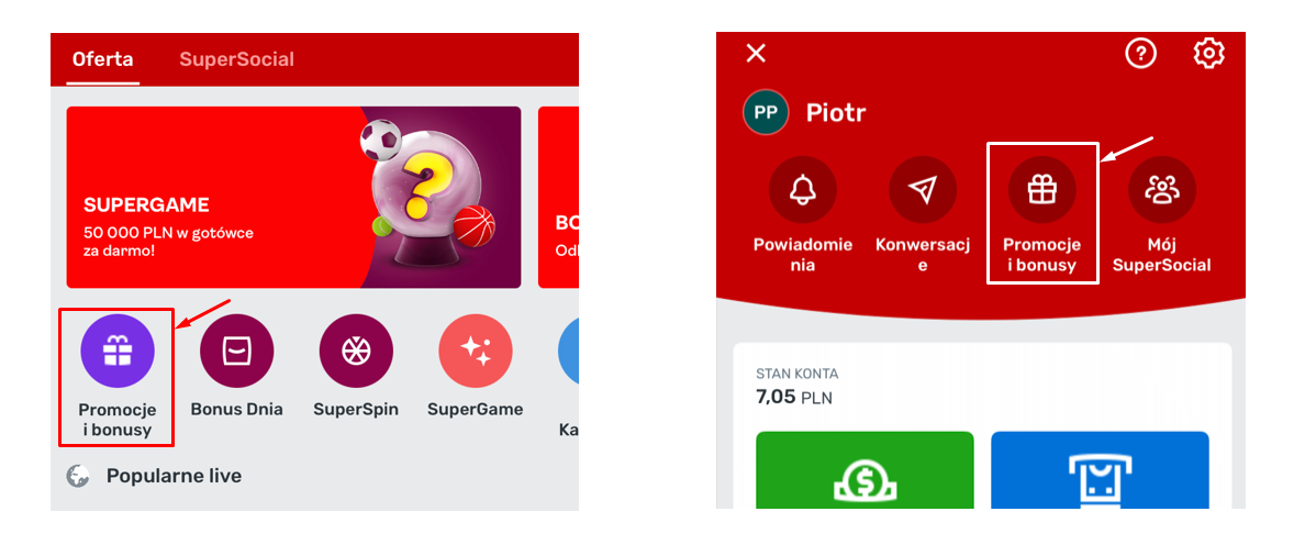 👉 Skróty do nowej sekcji "Promocje i bonusy" znajdują się: w menu głównym oraz w menu profilu użytkownika.