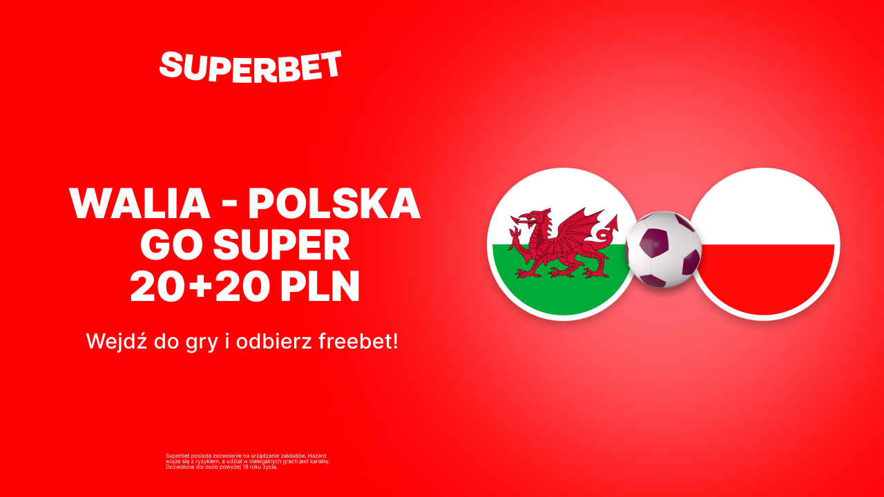 W Cardiff będzie dziś naprawdę gorąco! Nasza reprezentacja już wkrótce stoczy swoje najważniejsze starcie tych kwalifikacji. Stawka jest ogromna: udział w Mistrzostwach Europy! Kibicuj naszym wspólnie z Superbet i ciesz się dodatkową dawką wrażeń, dzięki unikalnej ofercie promocyjnej - wystarczy, że postawisz singla za przynajmniej 20 PLN na mecz z Walią, a freebet 20 PLN zasili Twoje konto gracza zaraz po rozliczeniu kuponu! No i SUPER!
