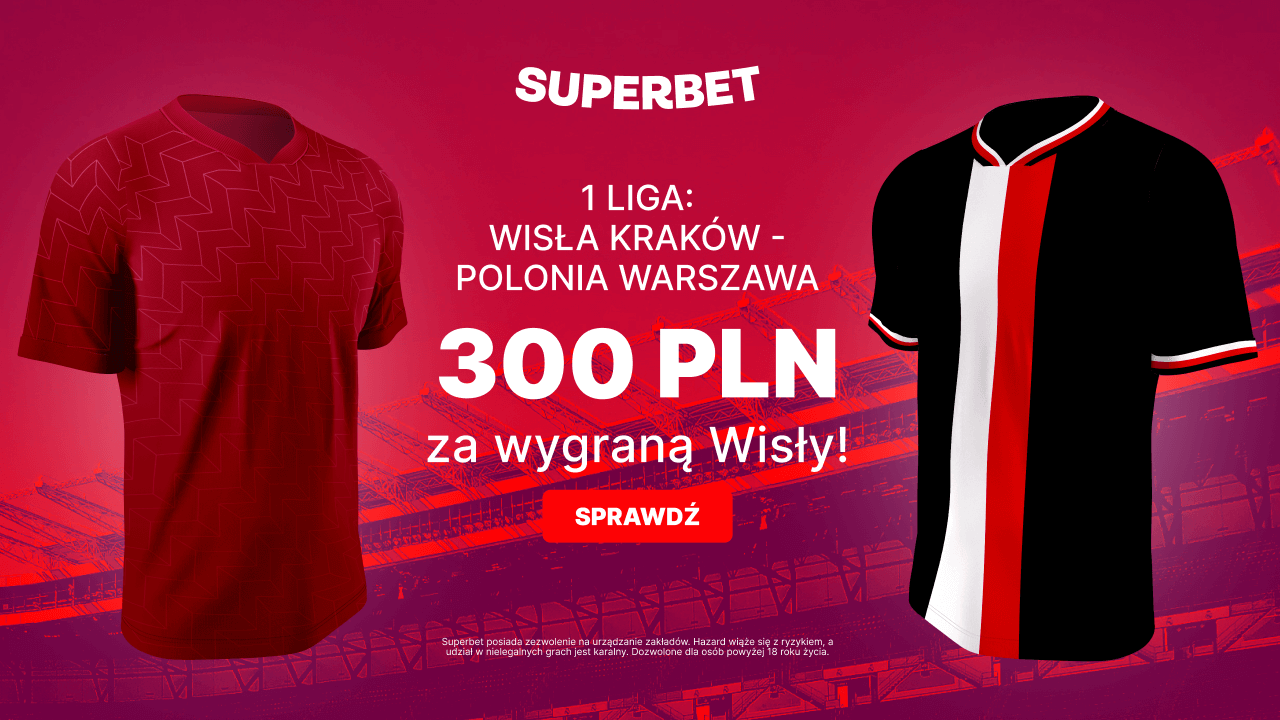Zarejestruj się w Superbet, wpłać pierwszy depozyt o minimalnej wartości 50 zł i postaw swój pierwszy kupon singiel, na którym znajduje się zakład z oferty przedmeczowej na zwycięstwo Wisły Kraków w meczu z Polonią Warszawa (wydarzenie odbędzie się w dniu 28.07.2024), stawiając minimalnie 2 PLN. Jeśli Twój kupon okaże się wygrany, otrzymasz Bonus 300 PLN.